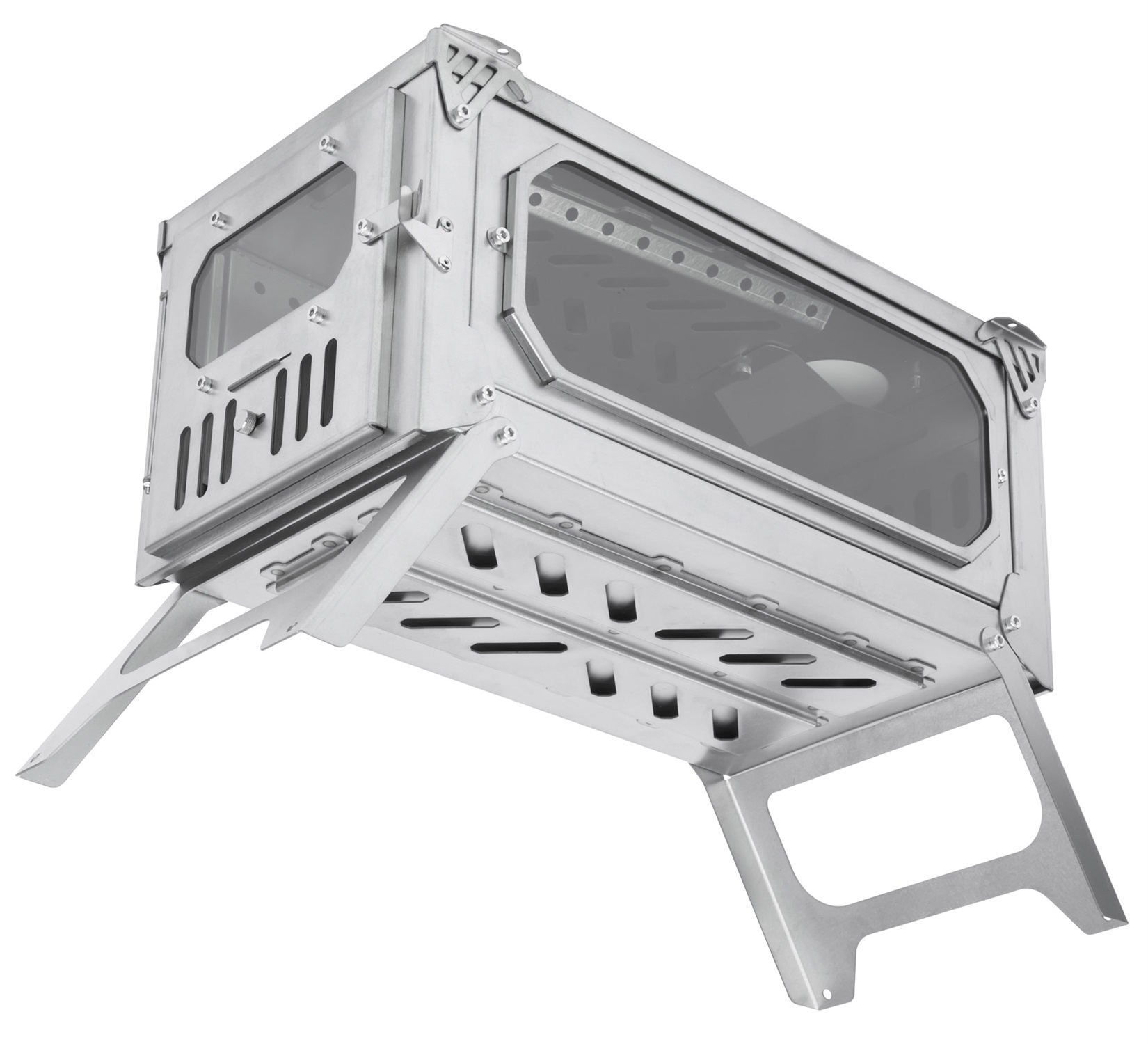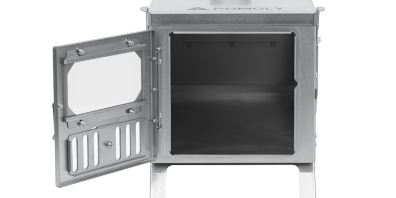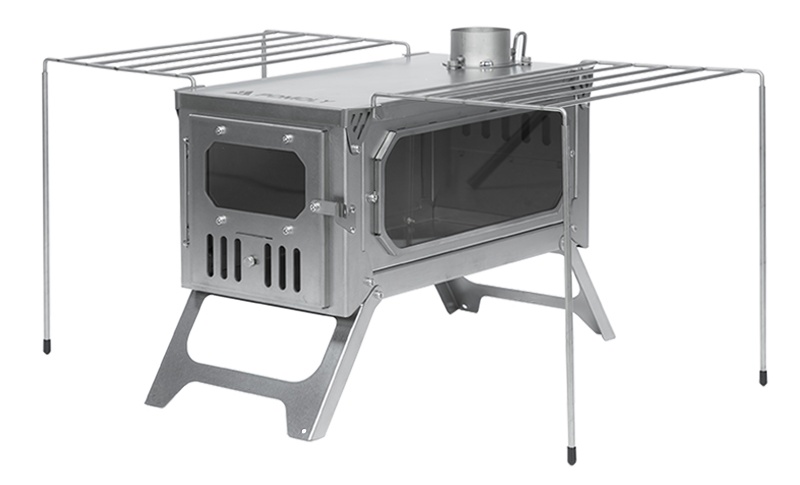 Le poêle T-BRICK a une porte avec une entrée d'air coulissante et un verre octogonal, de sorte que vous pouvez affiner le taux de combustion. La surface de l'entrée d'air a été augmentée de 15 %, ce qui permet au poêle de chauffer la tente en très peu de temps pendant l'hiver froid.