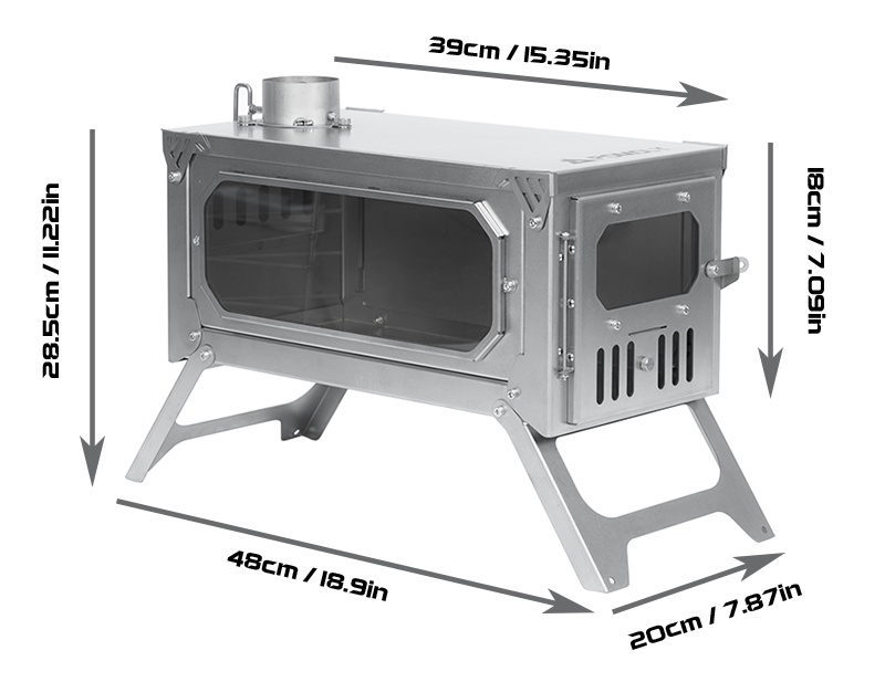 CHART Type de poêle Poêle en titane léger Poids (Sans cheminée) 6.6 lb / 3 kg Dimensions de pliage 15.4 x 7.9 x 3.2 in (39 x 20 x 8 cm) Dimension du Firebox 15.4 x 7.9 x 7.1 in (39 x 20 x 18 cm) Dimension d'assemblage 15.4 x 7.9 x 11.2 in (39 x 20 x 28.5 cm) Taille du verre latéral 11.4 x 3.9 in (29 x 10 cm) Longueur de tuyau (stockage) 9.5 in / 24 cm Longueur de tuyau 6.56ft / 2m or 9.84ft / 3m Diamètre du tuyau 2.36 in / 6 cm Spark Arrestor Yes Matériel Titane Epaisseur 1mm (GR1/TA1) Volume du Firebox 14L